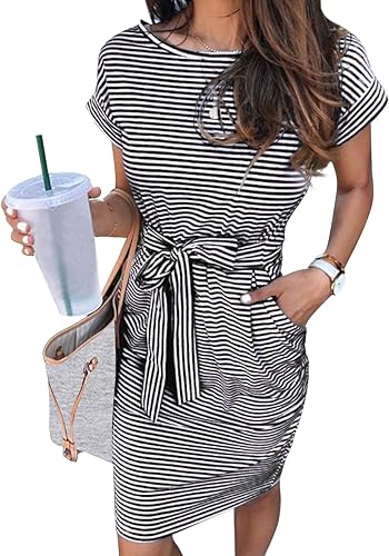 Women's Summer Striped Short Sleeve T Shirt Dress Casual Tie Waist with Pockets